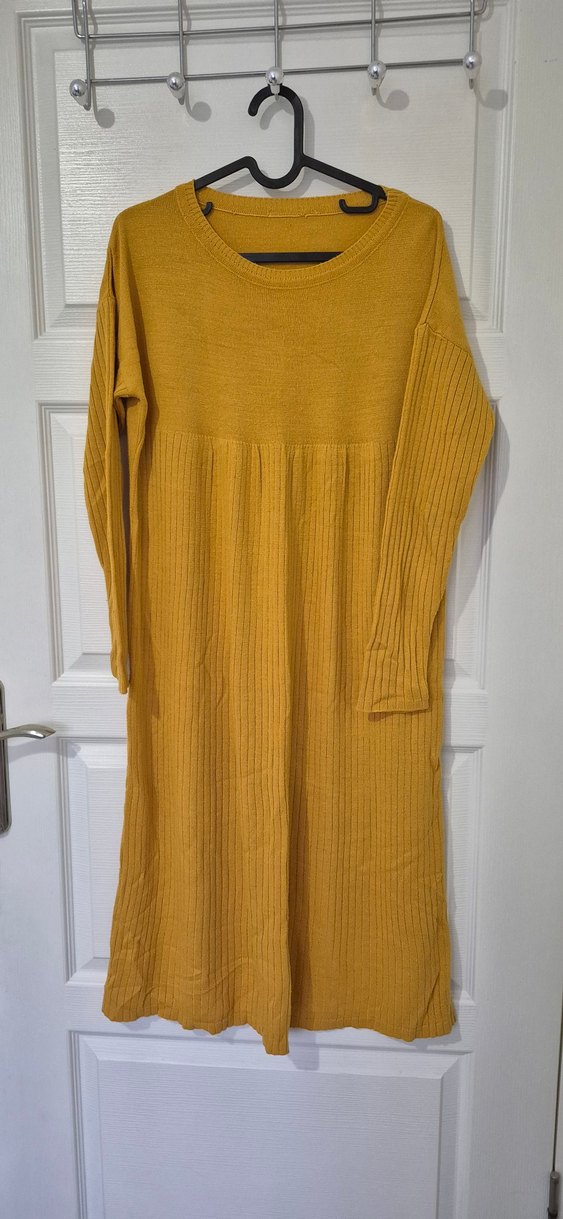 Sarı örme kumaştan, uzun kollu, yuvarlak yakalı, bol kesim rahat elbise. Günlük kullanıma uygun, bohem ve retro tarzıyla öne çıkar.