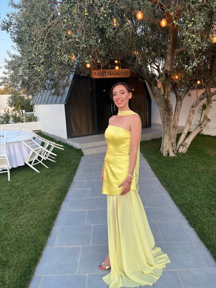 Sarı uzun abiye, straplez yaka ve drapeli tasarıma sahip, regular fit ve kolsuz stilde, düğünler için uygun. Ürün 36 beden fakat kalıbı bir tık dar olduğundan 34 bedene uygun 52 kilo 165 boy 10 cm topuklu ile giyildi. Fiyatta değişiklik yapılabilir.