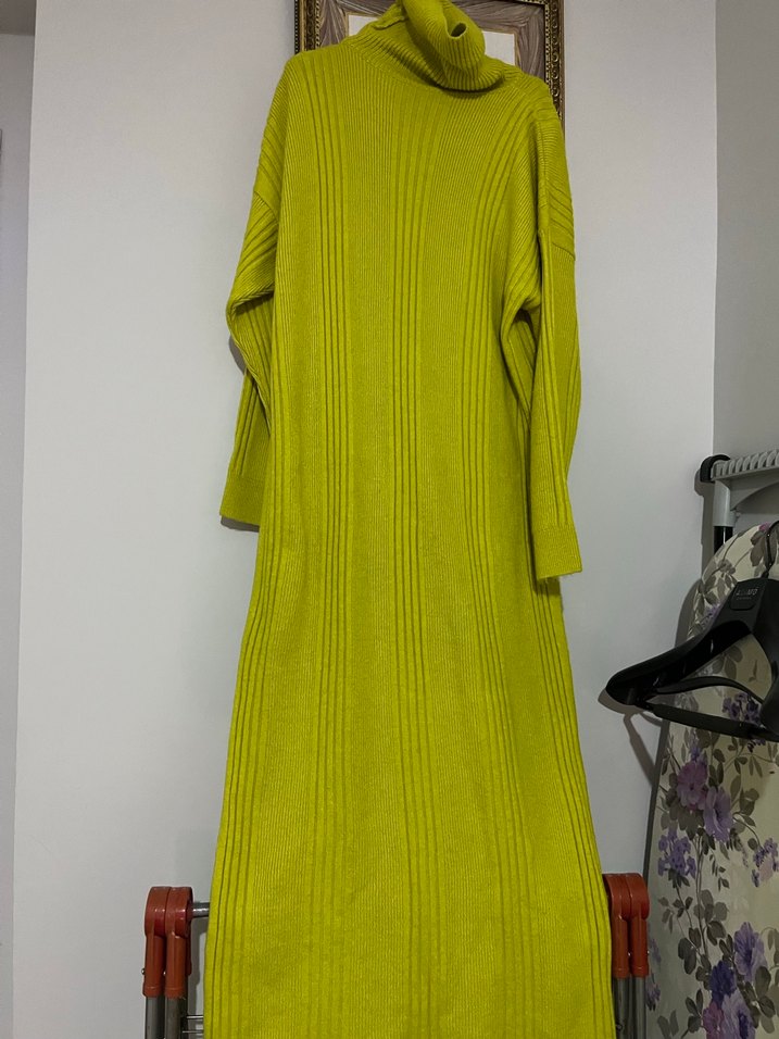 Sarı renkli, balıkçı yakalı ve uzun kollu, dikey kabartmalı desenli uzun triko elbise. Rahat ve konforlu, günlük kullanıma uygun.
