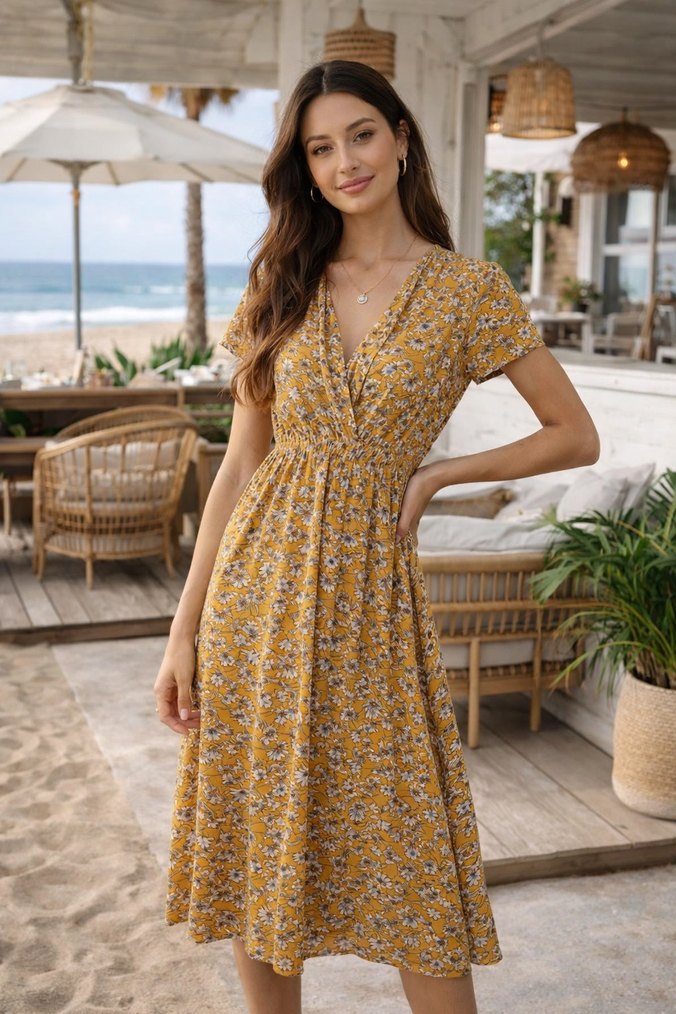 Sarı uzun elbise, V yakalı ve kısa kollu, bol kesimdir. Drapeli tasarımı ve pastel çiçek desenleriyle yumuşak sentetik kumaştan üretilmiştir. Açık hava etkinlikleri için uygundur.