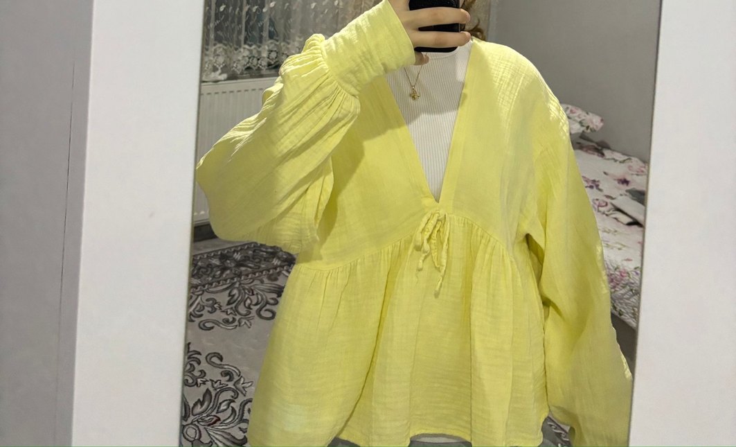Pastel sarı keten bluz, V yaka ve uzun drapeli kolları ile bol kesim ve midi boyda, günlük bohem tarzı için uygundur.