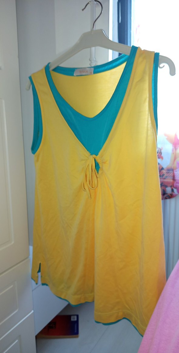 Sarı, V yakalı, drapeli ön bağlamalı, yumuşak sentetik kumaştan üretilmiş, rahat ve bol kesim hamile bluzu.