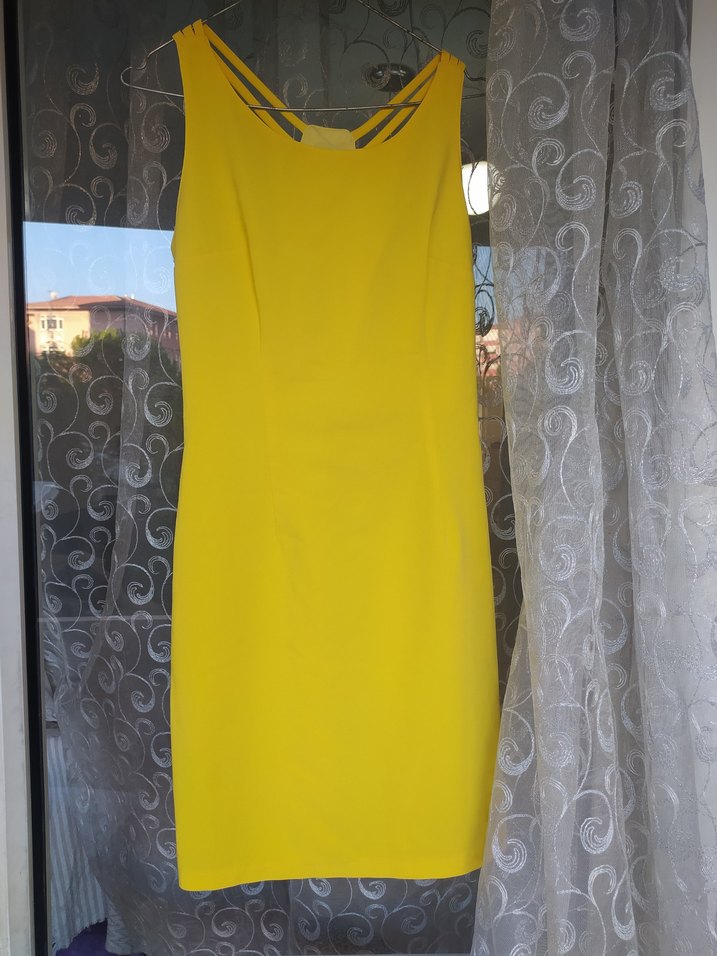 Sarı, V yakalı, kolsuz ve drapeli midi elbise, ince kesimi ve parlak dokusuyla modern bir görünüm sunar.