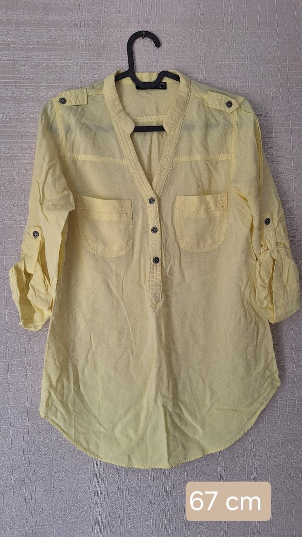 Sarı, düğmeli ve V yakalı, uzun kollu, cepli, bol kesim kadın gömlek. Günlük kullanıma uygundur.