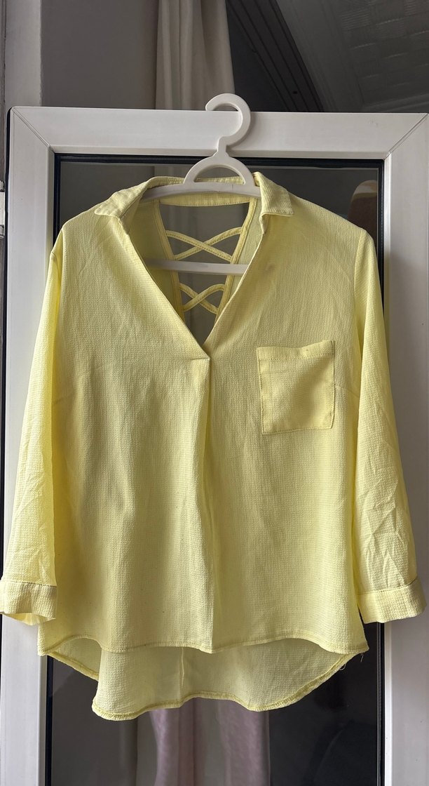 Sarı keten kumaştan, V yaka, düğmeli ve sırtı bant detaylı bol kesim gömlek. Günlük rahat kullanıma uygun bohem tarz.