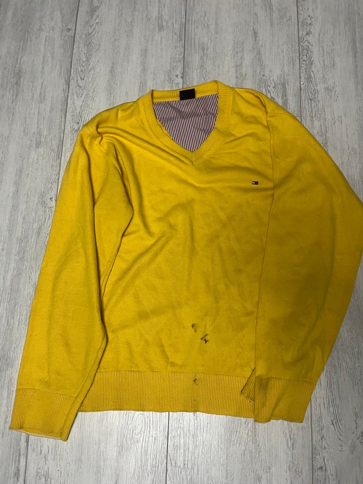 Bu sarı erkek triko, parlak keten kumaştan yapılmış, V yaka ve uzun kolludur. Rahat kesimi ve normal boyu ile günlük sokak stiline uygun şık bir parça.
