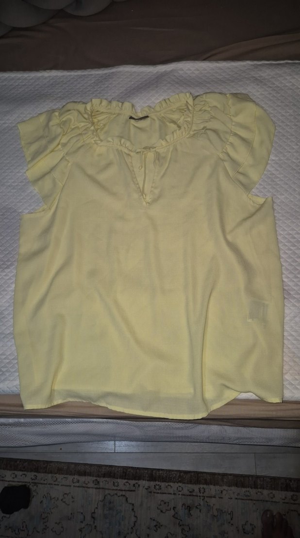 Yumuşak ince kumaştan, kısa kollu, V yakalı, bol kesim sarı bluz. Yaka çevresinde bohem tarzı fırfır detayları bulunur ve ayarlanabilen kordon vardır. Yaz aylarinda terletmez giyimi rahat. Sayılı kez giyilmiştir. Temiz,defosuz.