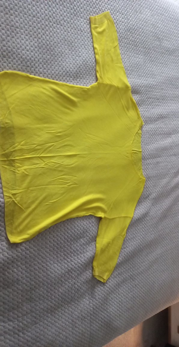 Parlak sarı renk, V yaka ve drapeli detaylara sahip, yumuşak sentetik kumaştan yapılmış bol kesim uzun kollu hamile tişörtü. Günlük kullanım için uygundur.