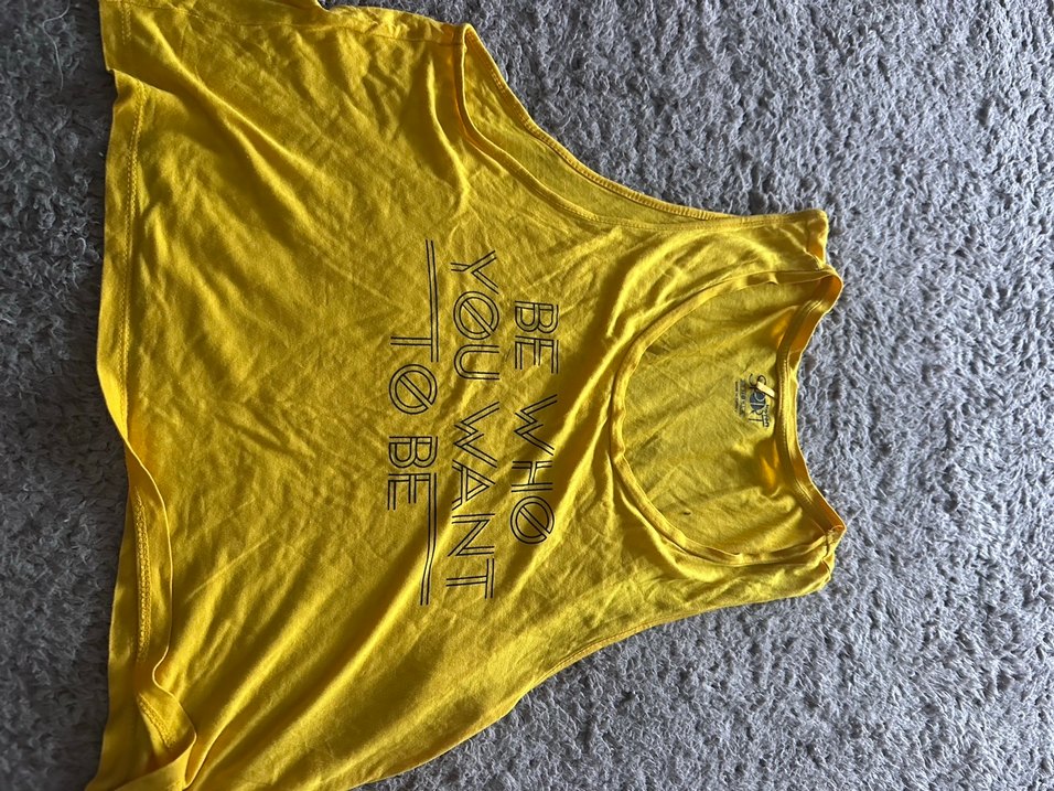 Sarı, V yakalı, baskılı yazılı kadın atlet. Sentetik kumaştan, bol kesim ve parlak görünümlü, sportif ve şık bir tasarım sunar. ♀️