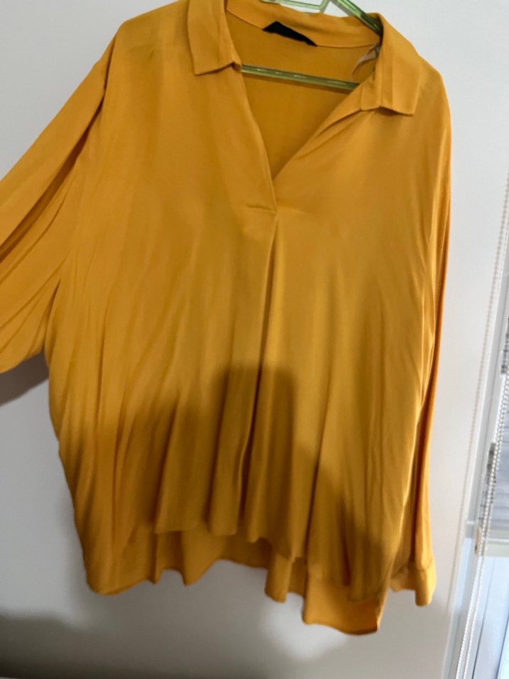 Sarı renkte, uzun kollu, bol kesim ve drapeli kadın bluzu. İpeksi kumaştan, V yakalı ve parlak, sade tasarıma sahip günlük kullanıma uygun.