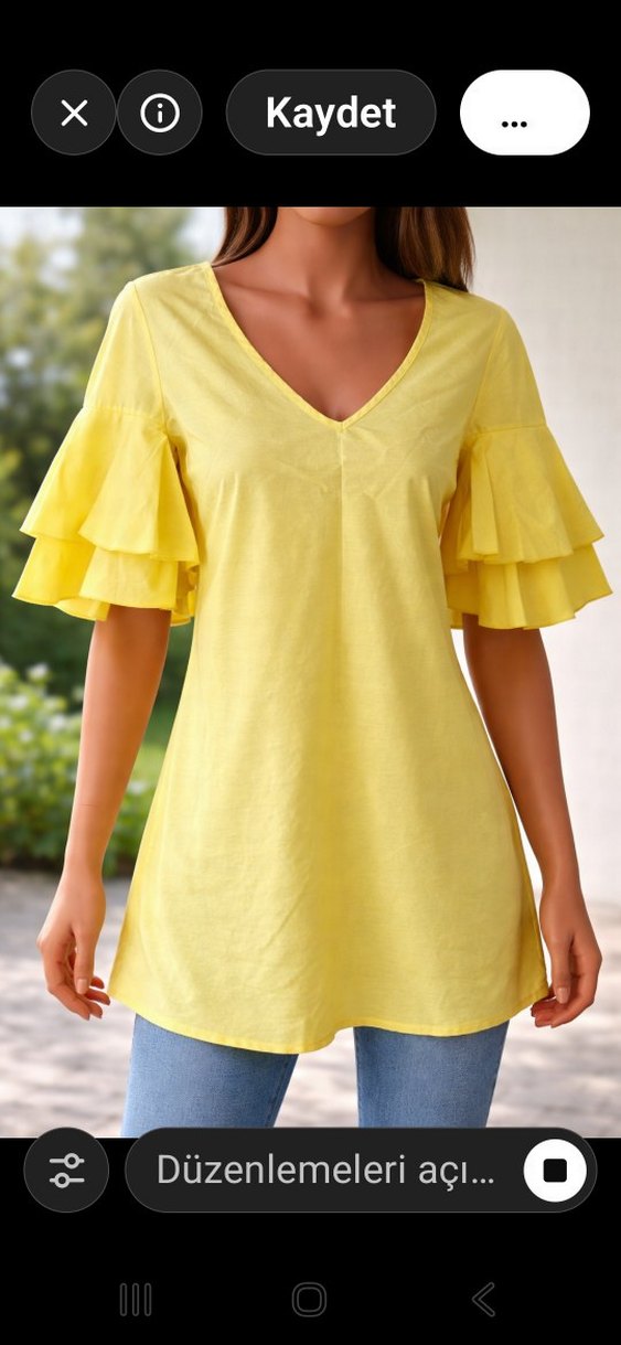 Sarı renkli, V yaka ve kat kat kısa kollu, bol kesim mini elbise. Yumuşak sentetik kumaştan yapılmıştır, bohem tarzı için uygundur.