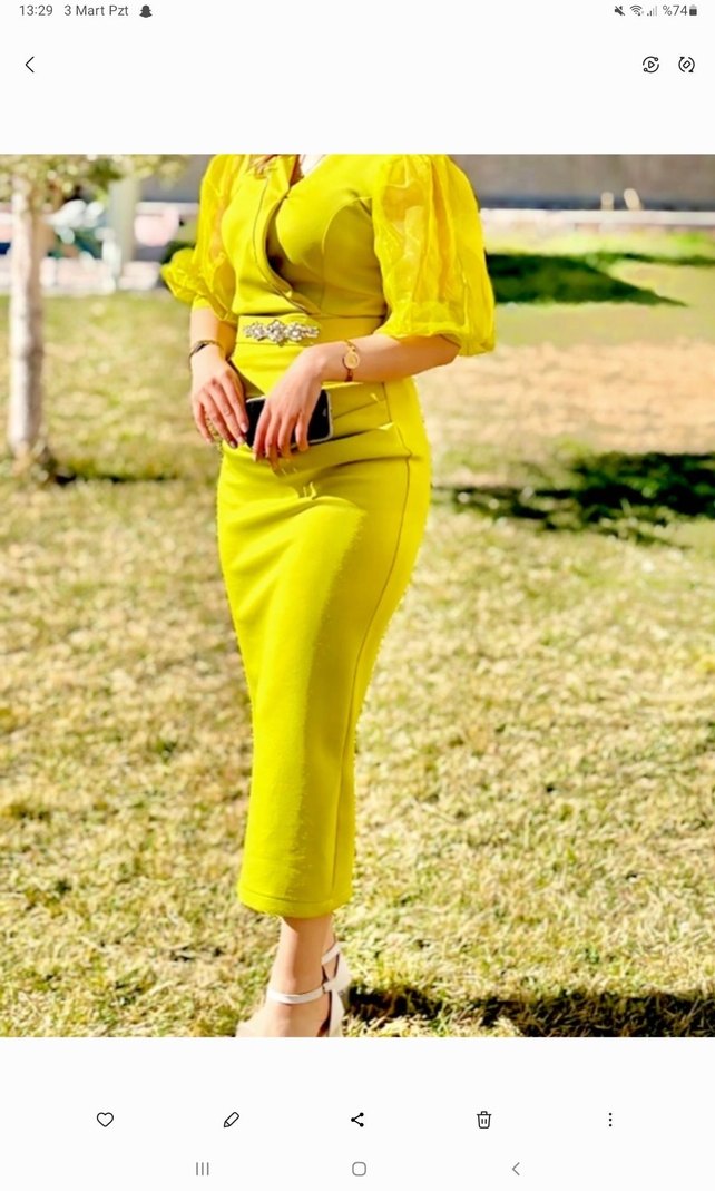 V yaka, kısa kabarık kollu, kemerli uzun sarı elbise, yumuşak sentetik kumaştan, düğünler için uygundur.