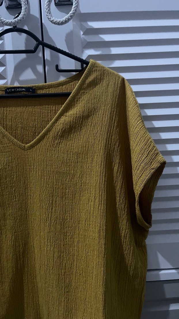 Sarı keten kumaştan, V yaka ve kısa kollu, bol kesim kadın bluz, gündelik kullanım için zahmetsiz şıklık sunar. Defosu yoktur çok az kullanıldı