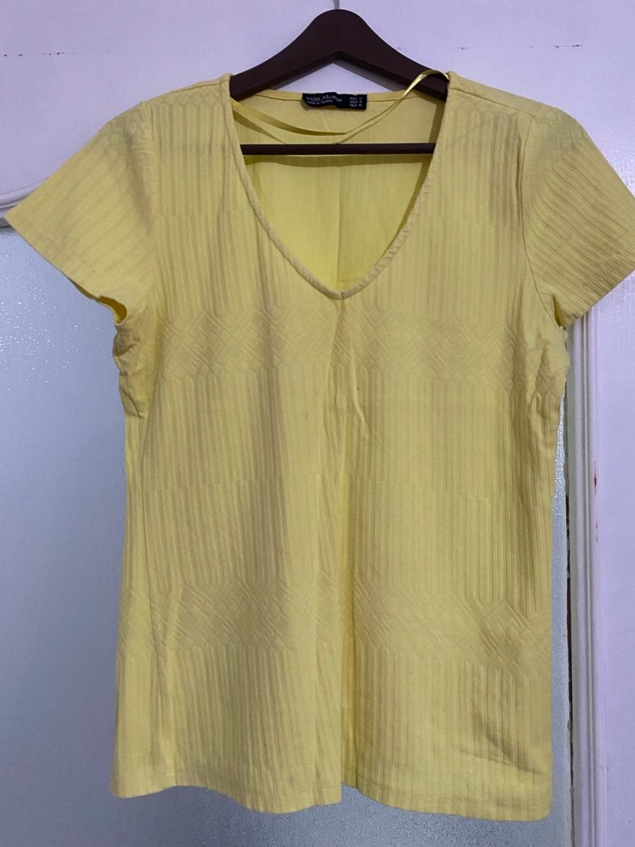 V yaka, kısa kollu, pileli detaylı sarı keten kadın bluz, rahat kesime sahiptir. Günlük sokak stiline uygundur. Önde lekesi var belli olmuyr cikan lekedir