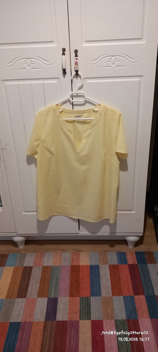 Sarı V yaka ve kısa kollu, normal boyda, rahat kesim bluz. Minimalist tarzda, günlük kullanıma uygun.