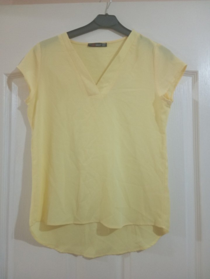 Sarı V yaka ve kısa kollu, salaş kesimli, desen içermeyen, günlük sokak stiline uygun gömlek az kullanıldı nokta kadar belirsiz bi lekesi var çikar muhtemelen hiç denemedim