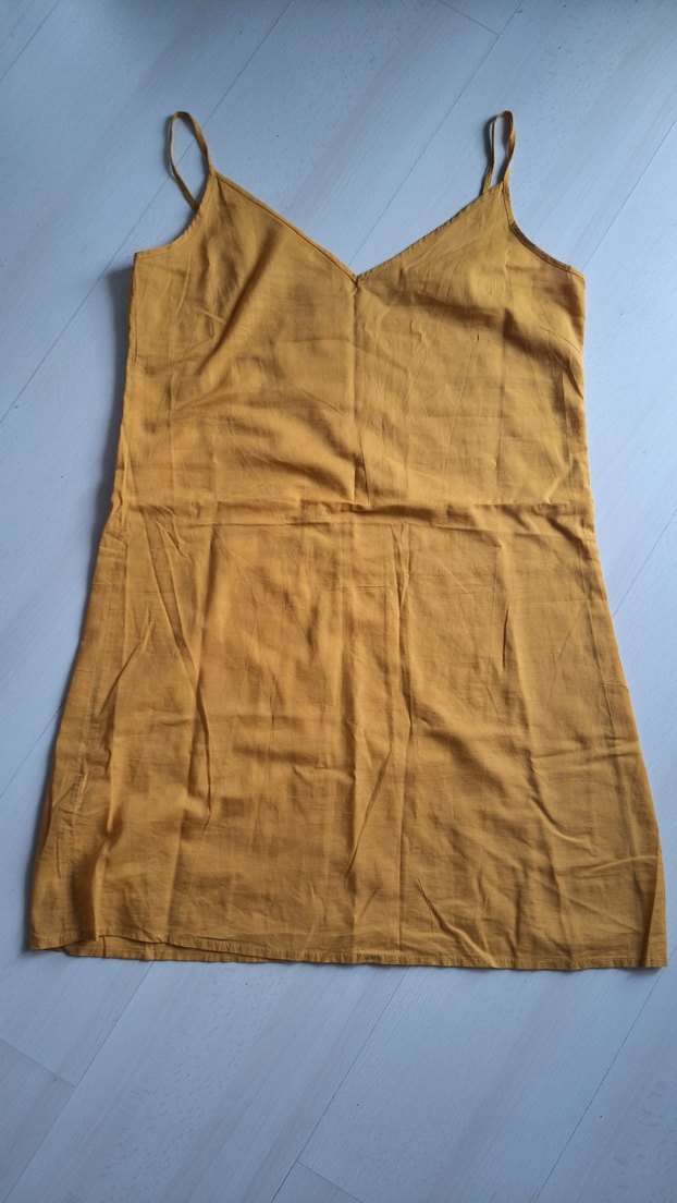 Sarı renkli, kolsuz midi elbise, V yaka ve bol kesimiyle keten kumaştan, drapeli tasarıma sahip rahat bir bohem stili sunar.