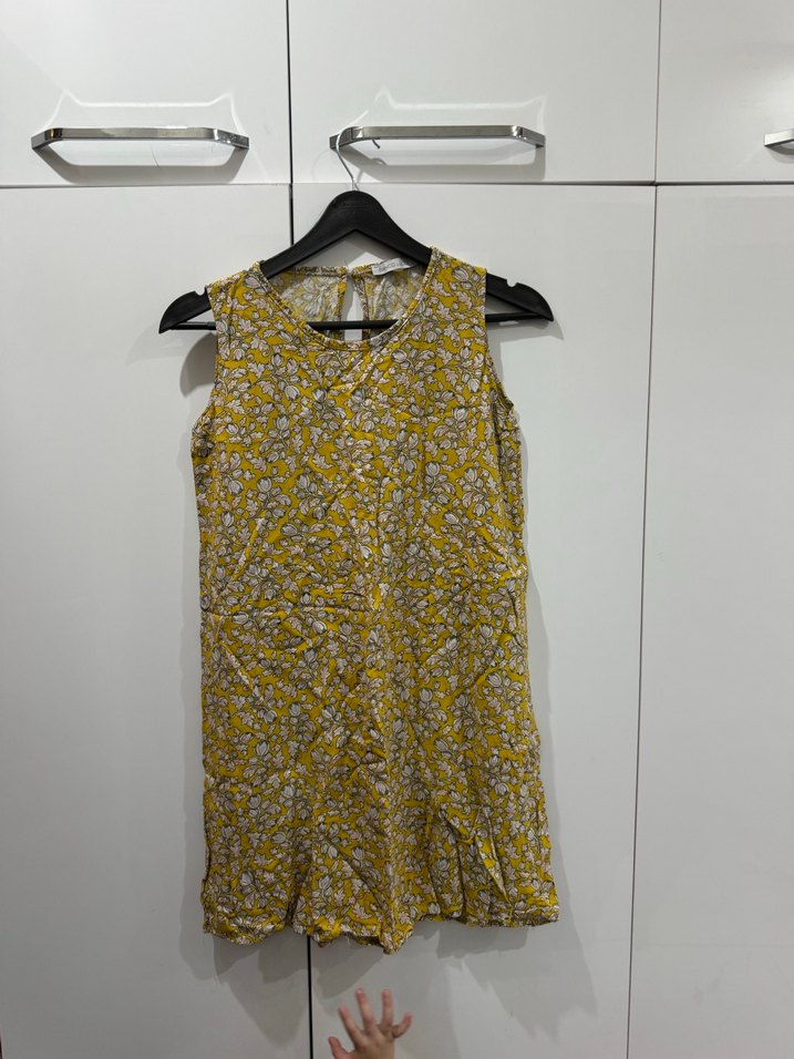 Sarı, kolsuz mini elbise, V yakalı ve bol kesimdir. Yumuşak sentetik kumaştan yapılmış, fırfır detaylıdır. Günlük kullanım için uygundur.