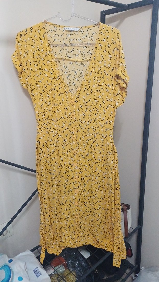 Sarı midi elbise, V yaka ve kısa kollu, bol kesimdir. Sentetik kumaştan, drapeli ve hafif batik desenlidir, bohem tarzda. Bağcıklıdır. Uzunluğu 107 cm.
