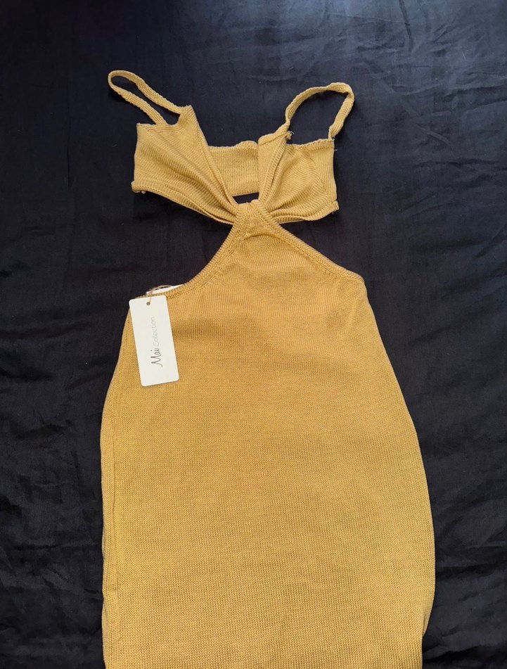 V yaka, kolsuz ve vücuda oturan midi elbise. Ön kısmında kesik detay ve koyu sarı renkte sentetik kumaştan üretilmiştir. Rahat sokak stili için uygun.