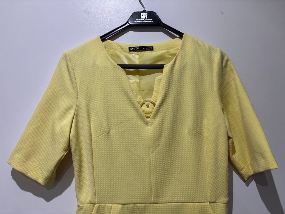 Sarı midi elbise, V yaka ve kısa kollu, düz kesim ve yumuşak sentetik kumaş. Minimalist, modern klasik tarzda, ofis için uygun.