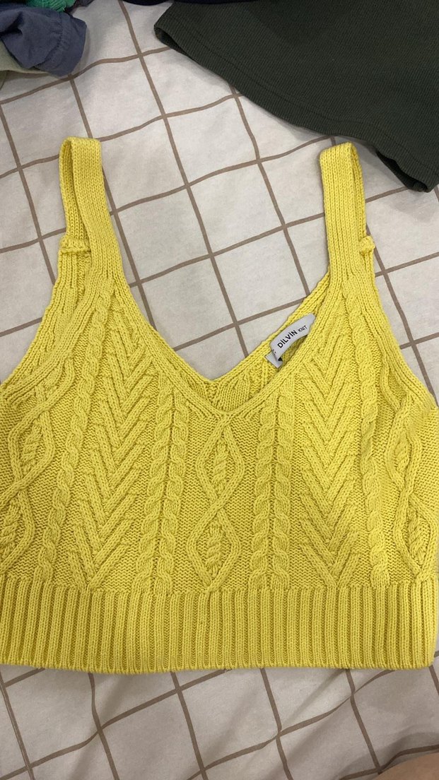 Sarı renkli, V yakalı ve askılı örgü kadın atlet. Fitted kesim, normal boyda ve rahat bohem tarzıyla günlük kullanıma uygun.