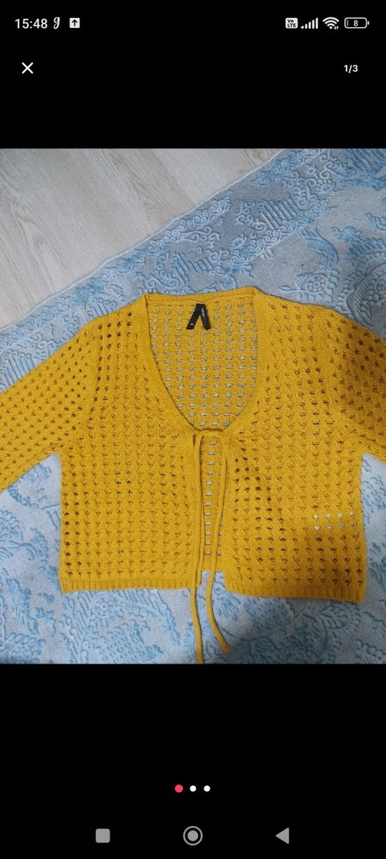 Sarı örgü kadın hırka, uzun kollu ve V yakalıdır. Gevşek kesim ve nakış detaylarıyla rahat ve şık bir modeldir.