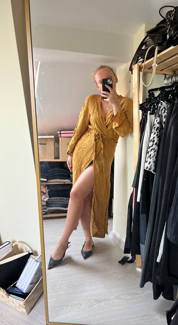 Kadınlar için parlak sarı, ipeksi kumaştan, bol kesim, uzun, drapeli elbise. İnce askılı kolları ve V yakası ile cesur, Paris tarzı normcore şıklığı sunar. Kimono önü açık