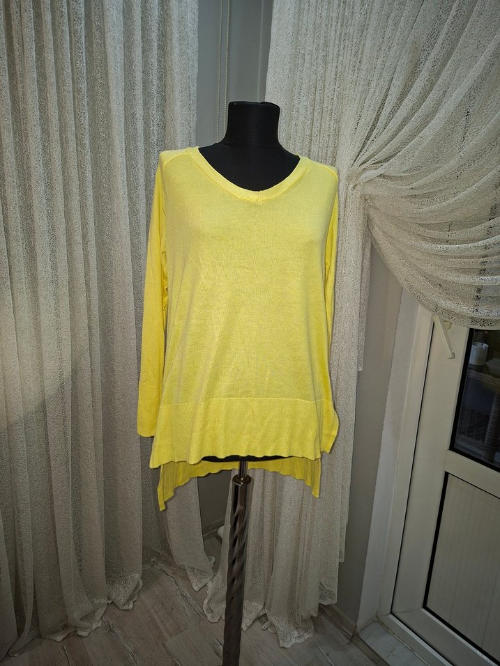 Sarı keten kadın kazak, V-yaka ve uzun kollu, bol kesim ve normal midi boyda, günlük kullanıma uygun çağdaş ve zahmetsiz şıklık sunar.