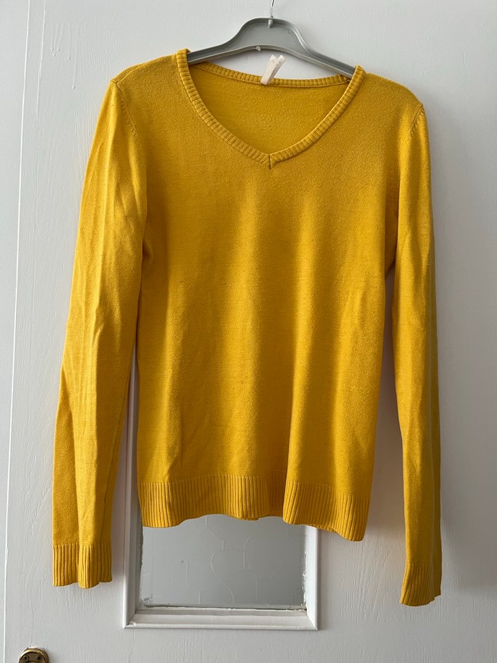 Bu kadın keten kazak, hardal sarı renkte, V yakalı ve uzun kolludur. Nefes alabilen keten kumaştan üretilmiş olup, bol kesim ve sade desensiz tasarıma sahiptir.