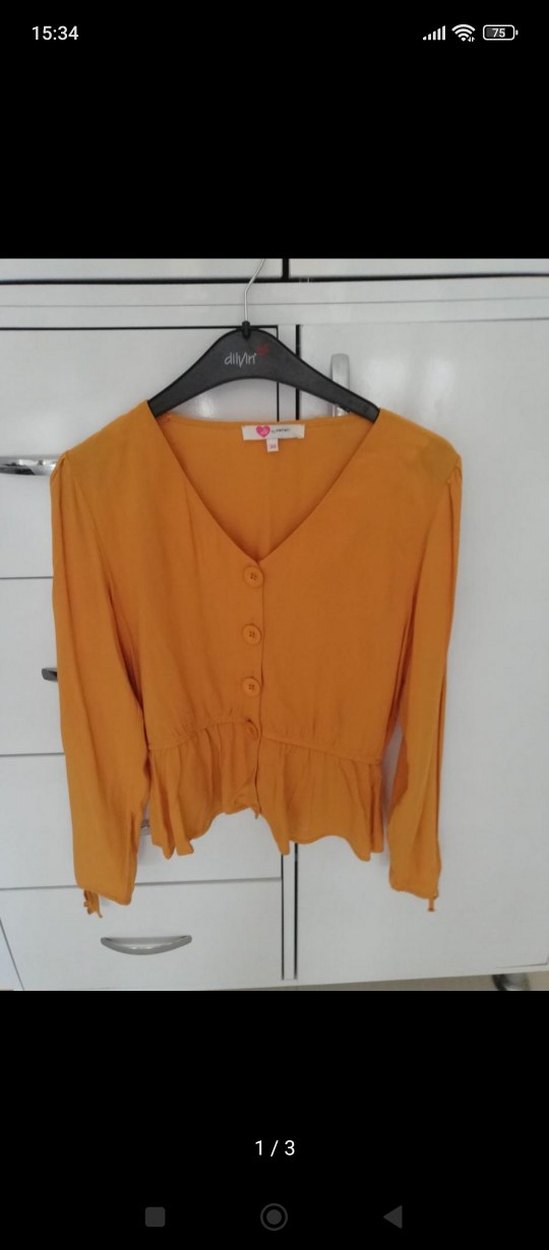 Sarı keten gömlek, uzun kollu ve V yakalıdır. Düğmeli ve midi boyda, rahat kesimlidir. Günlük sokak stiline uygundur.