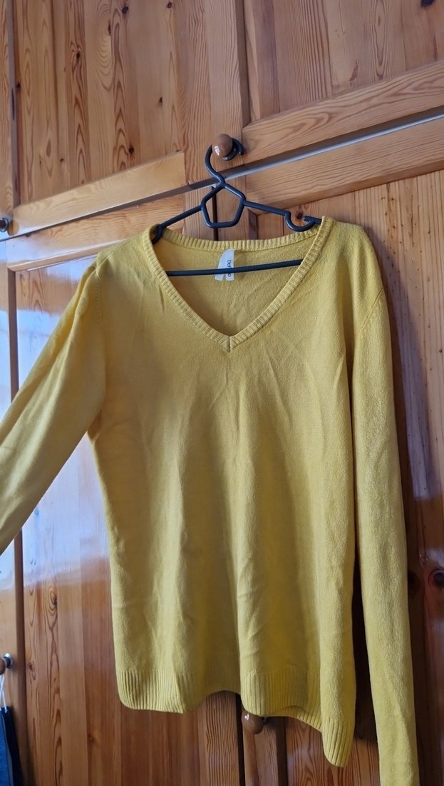 Sarı renkli, parlak keten kumaştan üretilmiş, V yaka ve uzun kollu kadın kazak. Rahat kesimi ve örme dokusu ile gündelik kullanıma uygundur.