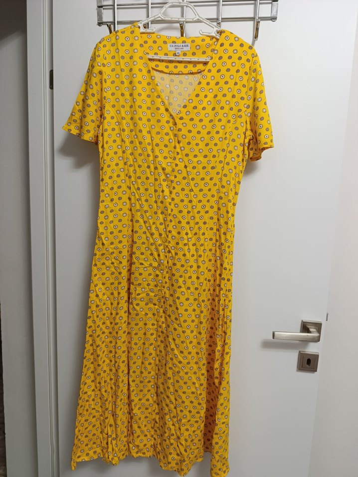 Sarı, kısa kollu, V yakalı uzun elbise. Renkli bağlama deseni ve bol, drapeli kesimiyle bohem vintage tarzını yansıtıyor.