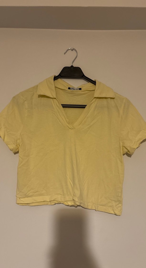 Sarı V yakalı, kısa kollu crop kadın tişörtü. Rahat kesimi ve kısa boyu ile günlük kullanıma uygundur.