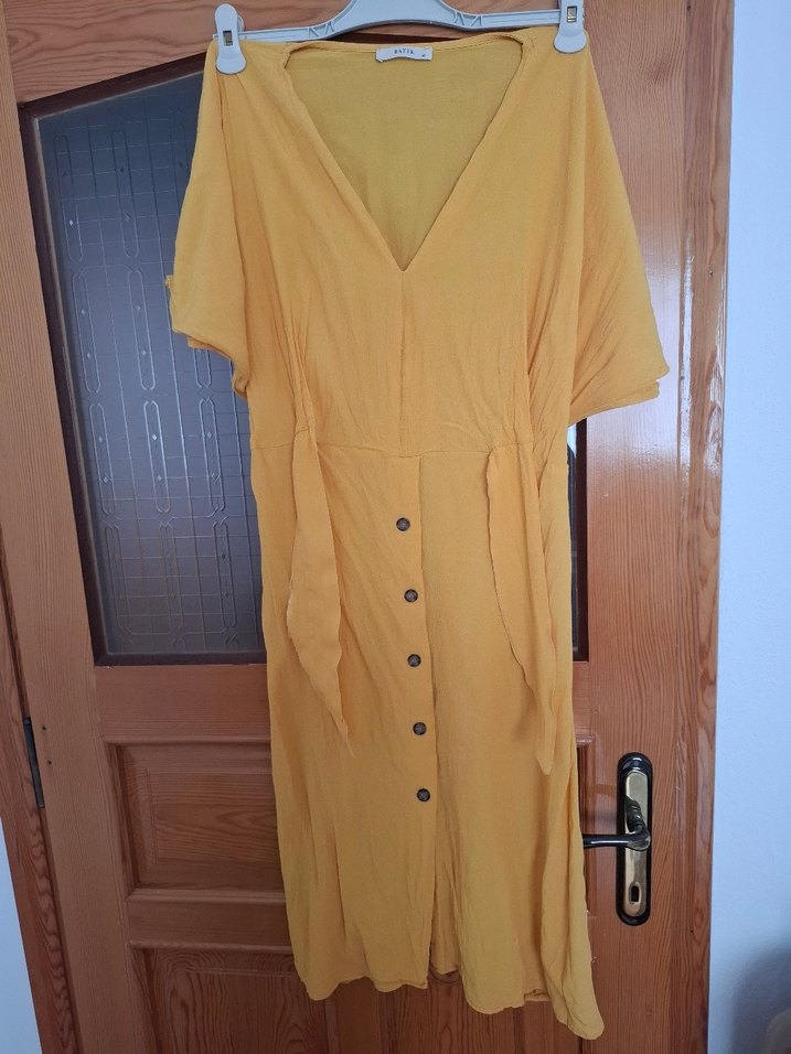 Yumuşak keten kumaştan yapılmış, V yakalı, kısa kollu,boy 110 kol altı 60cm 65 cm e kadar esniyor arkadan lastikli onde bağlama yerinde sökülme var resimde belirttim onun haricinde hic bir sorunu yok dügme görünümlü olan yerler dikişlidir acilma sorunu olmuyor rahat tril tril bir kumaş 42 beden desede 46 beden e kadar olur batik markası kalıpları büyüktür bilen bilir