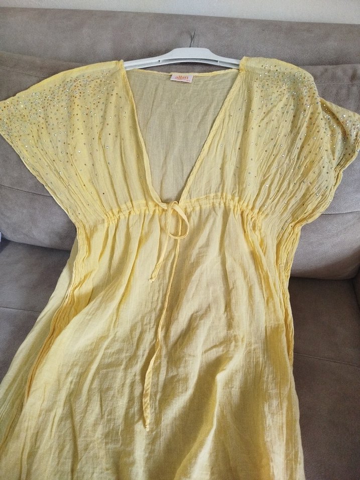 Sarı ince gecelik yada plaj elbisesi olarak kullanilir V yakalı, drapeli, kolsuz bohem Midi boy ve bol kesim, pastel renkte.