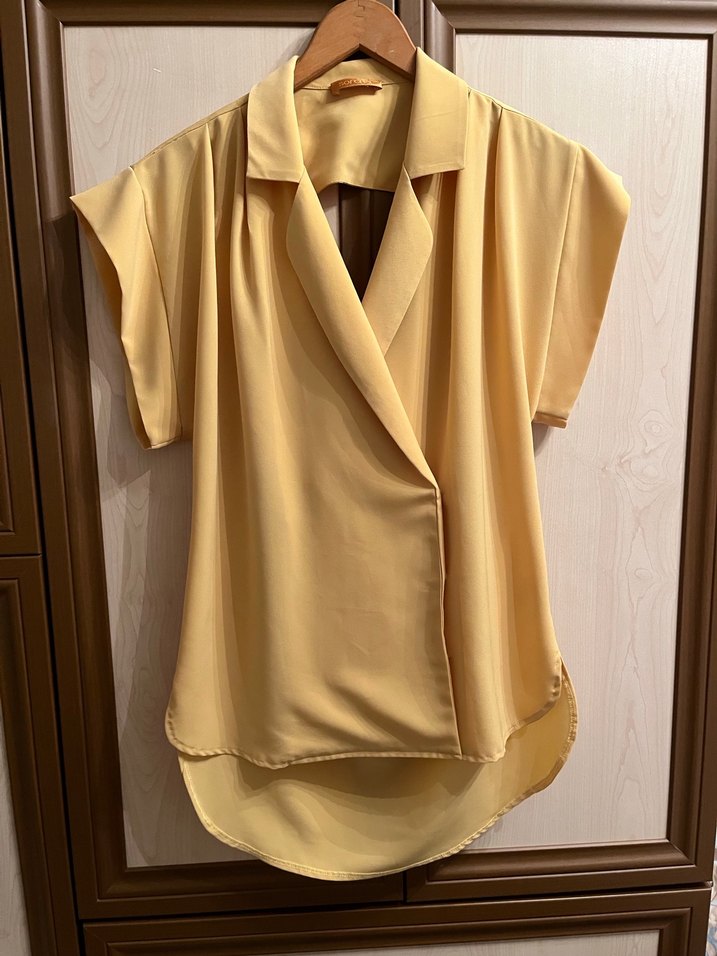 Sarı renginde, V yakalı ve kısa kollu kadın bluz. İpek gibi kumaştan, bol ve drapeli kesimiyle modern ve şıkbir tarz sunar.