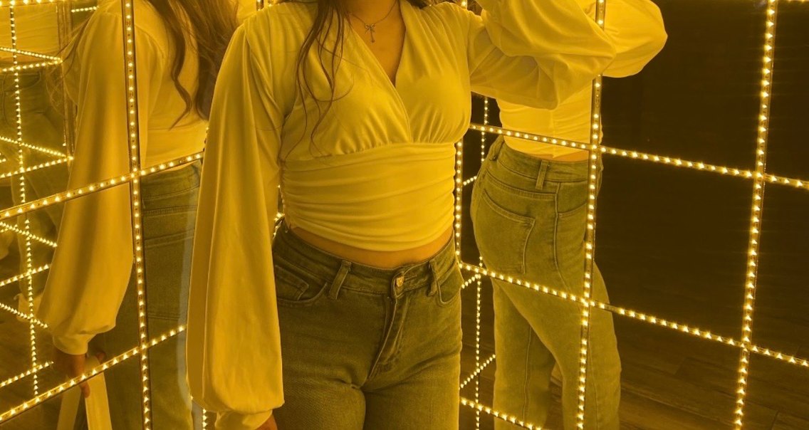 Sarı renkli, V yakalı ve uzun kollu kadın bluz. Denim kumaştan, midi boyda, rahat ve şık bir görünüme sahip. Parti ve günlük kullanıma uygun.