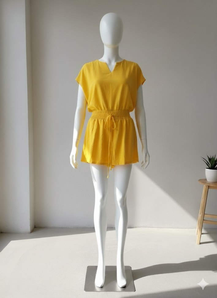 Sarı mini tulum, V yakalı ve kısa kollu, bol kesimdir. Elastik bel ve bağcık detayına sahip, yumuşak sentetik kumaştan yapılmıştır. Günlük kullanım için rahat ve şık bir seçimdir.