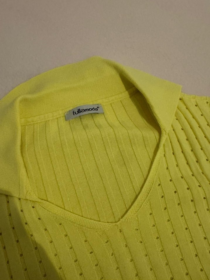 Fullamoda marka, sarı renkli, V yakalı, uzun kollu, kısa kesim, düz desensiz kadın triko kazak. Rahat ve şık bir günlük tercih.