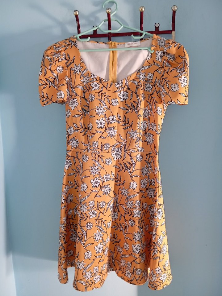 Sarı midi elbise, V yakalı ve kısa kolludur. Renkli çiçek desenli, bol kesim ve drapeli detaylıdır, günlük sokak stili için uygundur.