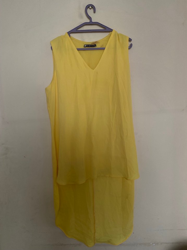 Sarı, V yakalı, kolsuz midi elbise, bol ve drapeli kesime sahiptir. İpeksi kumaştan, minimalist ve şık bir gündelik stil sunar.