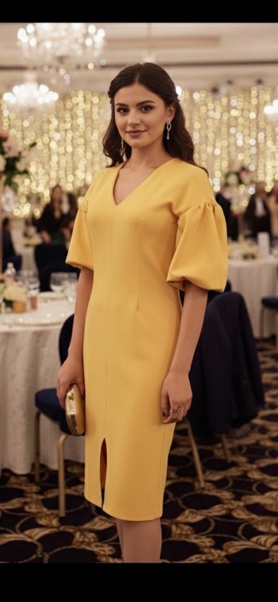 Sarı midi kalem elbise, V yakalı ve kabarık kısa kolludur. Normal kesim ve canlı renk dokusula ofis için uygundur.