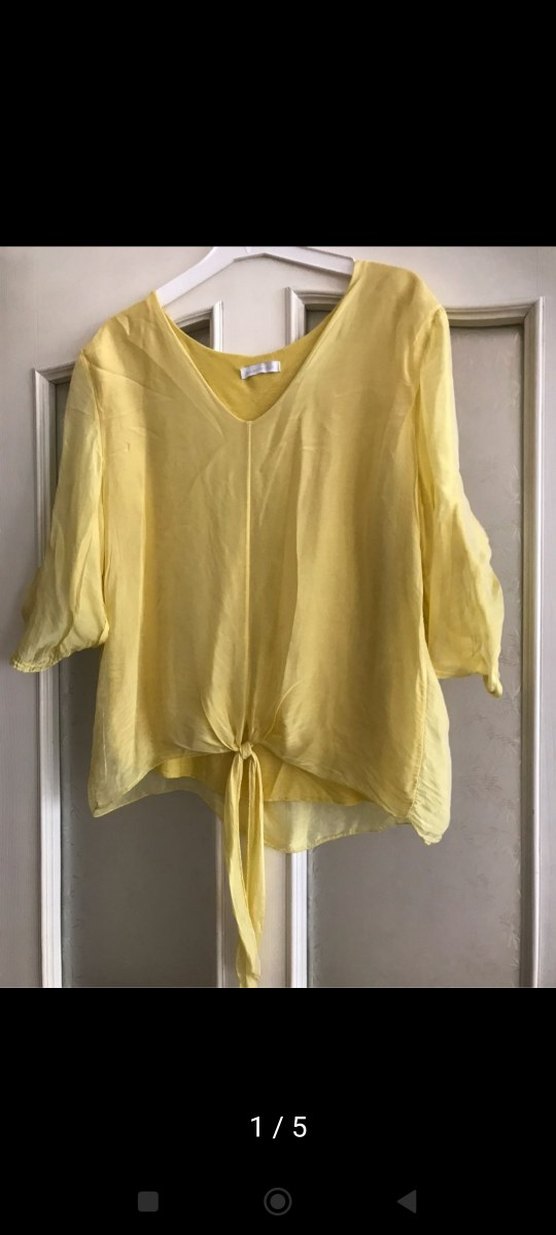 Sarı ipek bluz, V yaka ve kısa kollu. Salaş kesim, drapeli ve bağcık detaylı, bohem tarzda rahat bir parça. marka temsilidir