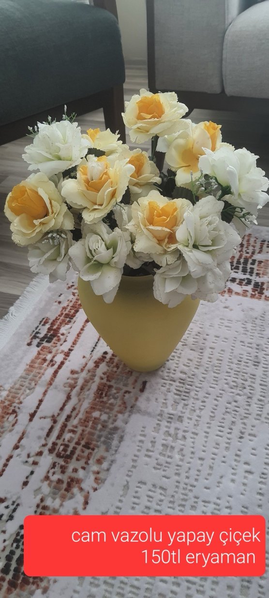Sarı vazoda beyaz ve sarı yapay çiçekler, mekana ferah bir görünüm katıyor.