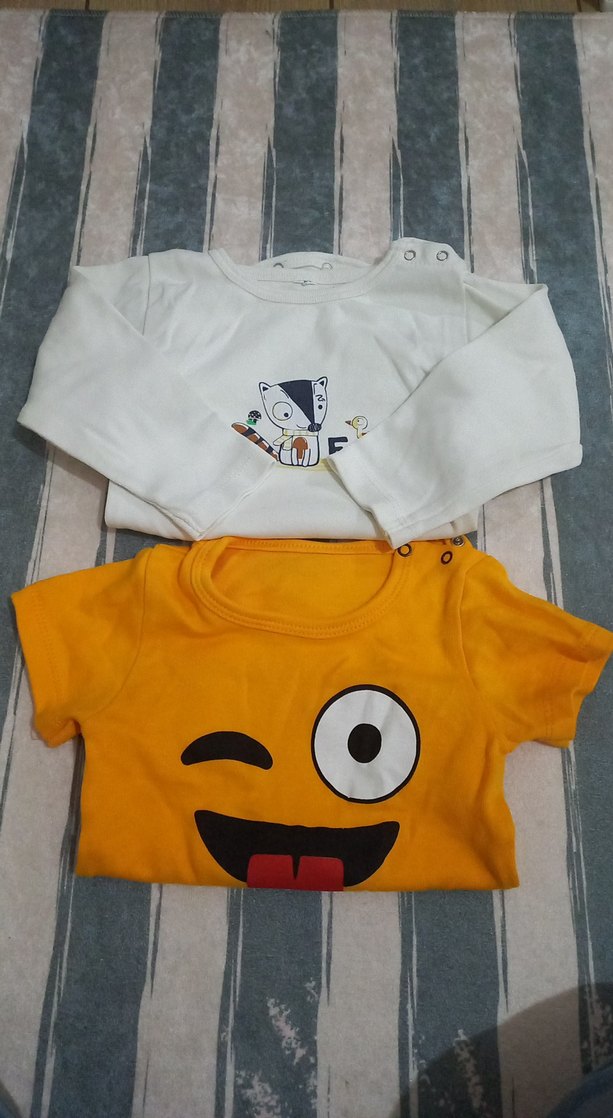 Yumuşak pamuklu iki bebek body: biri sarı, kısa kollu, göz kırpan yüz baskılı, düğmeli; diğeri beyaz, uzun kollu, kedi baskılı, düğmeli. Iki ürün fiyatıdır