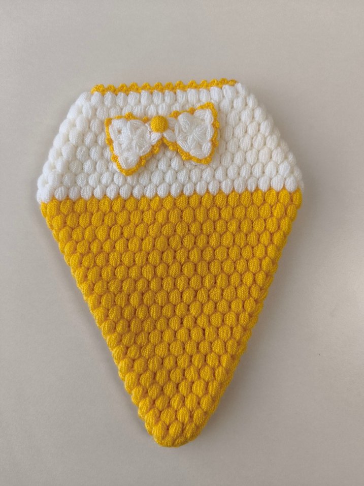 Sarı ve beyaz renklerde, dokulu yüzeye sahip ve küçük bir fiyonk süslemeli yumuşak banyo lifi