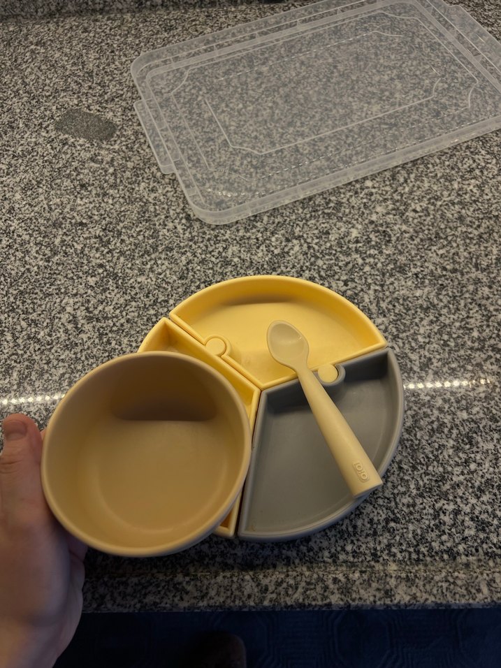 Sarı ve gri renkte bölmeli çocuk tabağı, kaşık ve ayrı bir kase içeren set. Çok az kullandım gerçekten güverek alabilirsiniz kaşık tabak kase hepsi dahildir max 3 kez kullandım aynı üründen hediye gelen 2 adet daha set olduğu için satıyorum