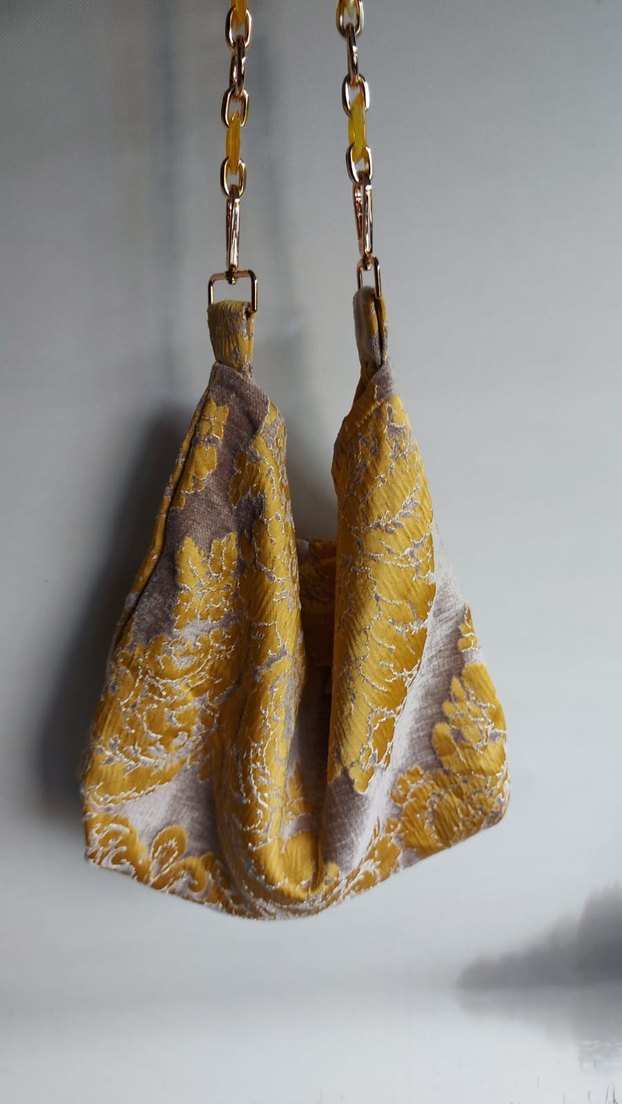 Drapeli, sarı ve gri desenli tekstil malzemeden üretilmiş, bohem vintage tarzda kadın çantası, günlük kullanıma uygundur.