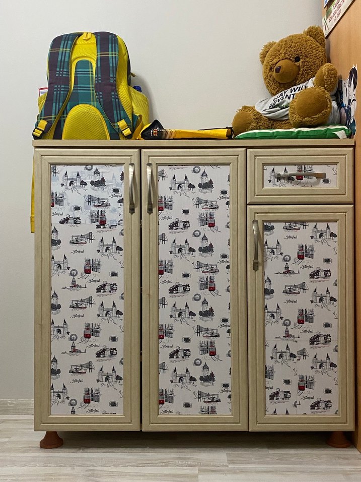 Gri ve sarı tonlarında, desenli panellere sahip çocuk dolabı. Düzenli saklama için çoklu bölmeleri bulunur sağlam